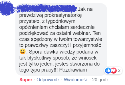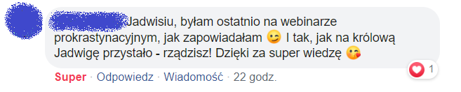 No cóż… bez owijania w bawełnę – tu i TERAZ, nie później ;) stwierdzam fakt, że webinar o prokrastynacji był po prostu przepełniony niezbędnymi informacjami. Profesjonalny, merytoryczny, wyczerpujący temat! Do tego ta super nuta poczucia humoru, lekkości i luzu Jadwigi – mam odczucie, że dostałam więcej niż się spodziewałam.